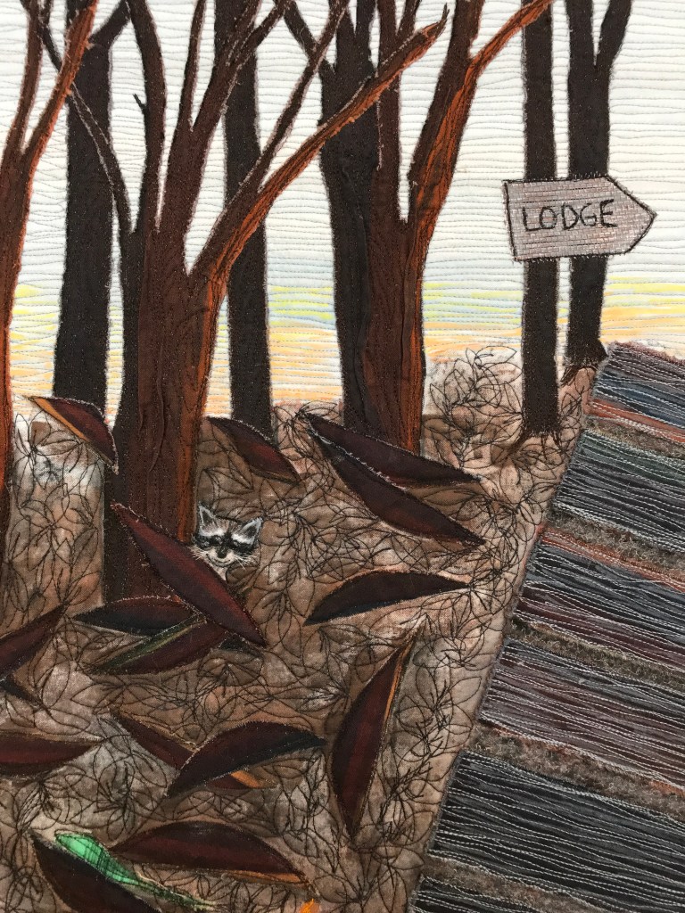 What do you get when you combine two distractable art quilters, a glorious autumn day and a very very confusing map? This piece is in honor of last year’s SAQA CT retreat and a very very long walk in the woods ;). One of the many images on my phone from our hike was this one: