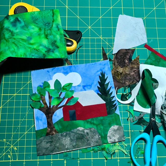 Step 3 – Choose fabrics to interpret your scene. My base for these squares is 6 1/2” square cuts of Windham Fabrics’ blender fabric collection “Bedrock” and my favorite batting, Quilters Dream. For this quilt, I used a blue background and fused a rich emerald green “grass” layer on, then began to build the scene. As always, the fabrics are the fabulous Lava Solids from Windham Fabrics/Anthology Batiks – ❤️. http://anthologyfabrics.com/lavafatq-1-rainbow/