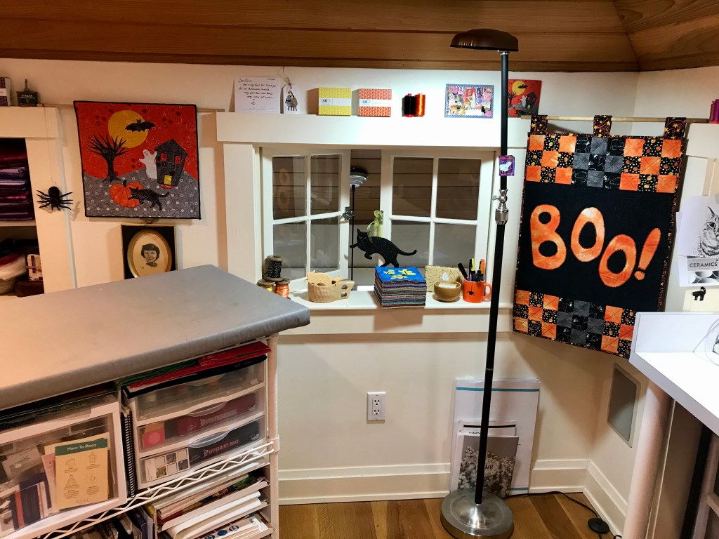 Sitting in the middle of the room, on wheels, is my rolling pressing station – my husband is a genius at designing these things! What an improvement from a rickety ironing board – this holds (some of) my quilting book collections and tons of small art supplies in small drawers. See those 2 rolls tucked in between the first and second plastic drawer sets? Rolls of my beloved Mistyfuse, the best ever fusible – more on that later this month! https://www.mistyfuse.com/