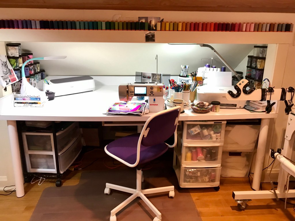 Turning right, you’ll see the alcove holding my enormous sewing table (see ‘brilliant husband’ above ;))…a perfect way to make use of every inch of this oddly-shaped space. A 🌈 of Aurifil 50wt spools just fits on the molding above…and the desk has plenty of room for my Bernina 570QE and serger, printer and my new favorite toy, my Cricut Maker. A very large surface means a very large amount of storage space beneath – more rolling plastic drawers accommodate an embarrassing amount of thread ☺️ and bins hold batting.