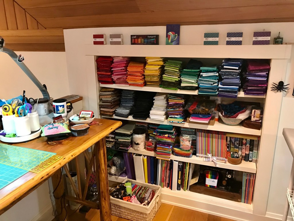 Turning to your right, you will see the built-in bookshelves…which are almost 😆 large enough to hold my stash. The mostly-solids are organized in rainbow order of course, with hand-dyeds and other special fabrics in their assigned places. See my Uppercase magazine and book collection? Love ❤️! https://uppercasemagazine.com/collections/books