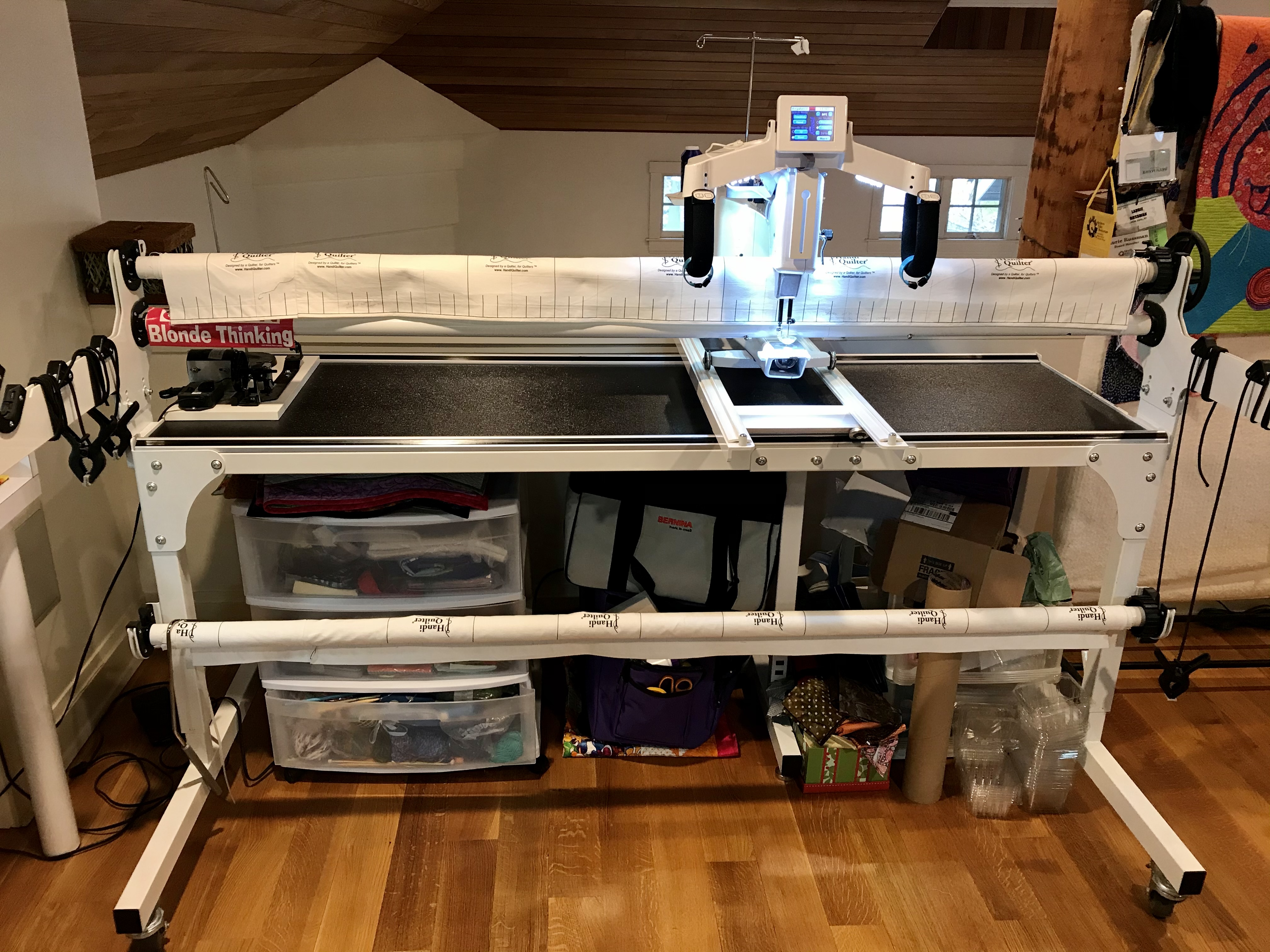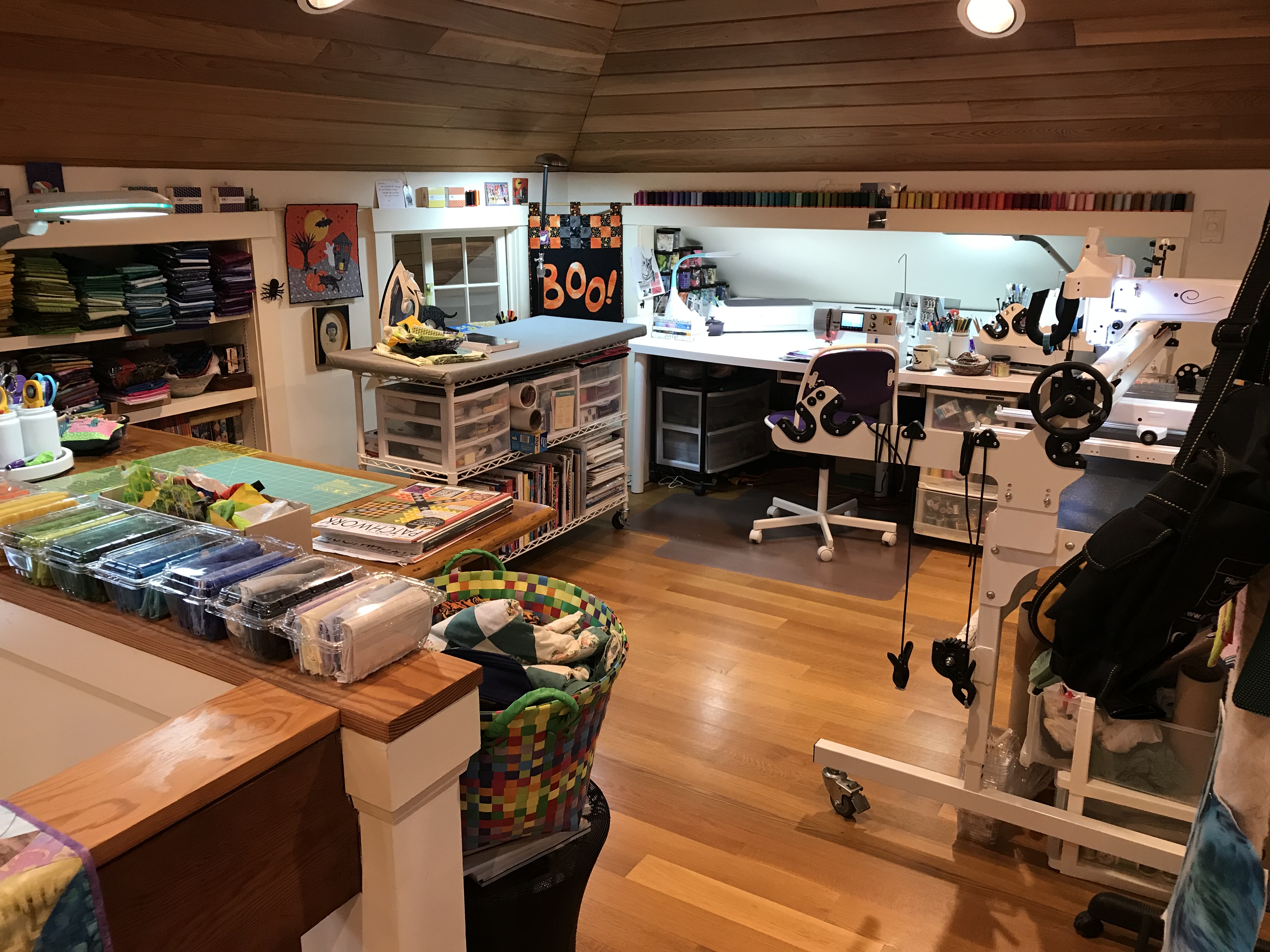 Turning right one last time, you’ll face my HandiQuilter Avante, table sized down to 6’ because 99% of my work is art quilts and I don’t need it to be any larger. More storage beneath!