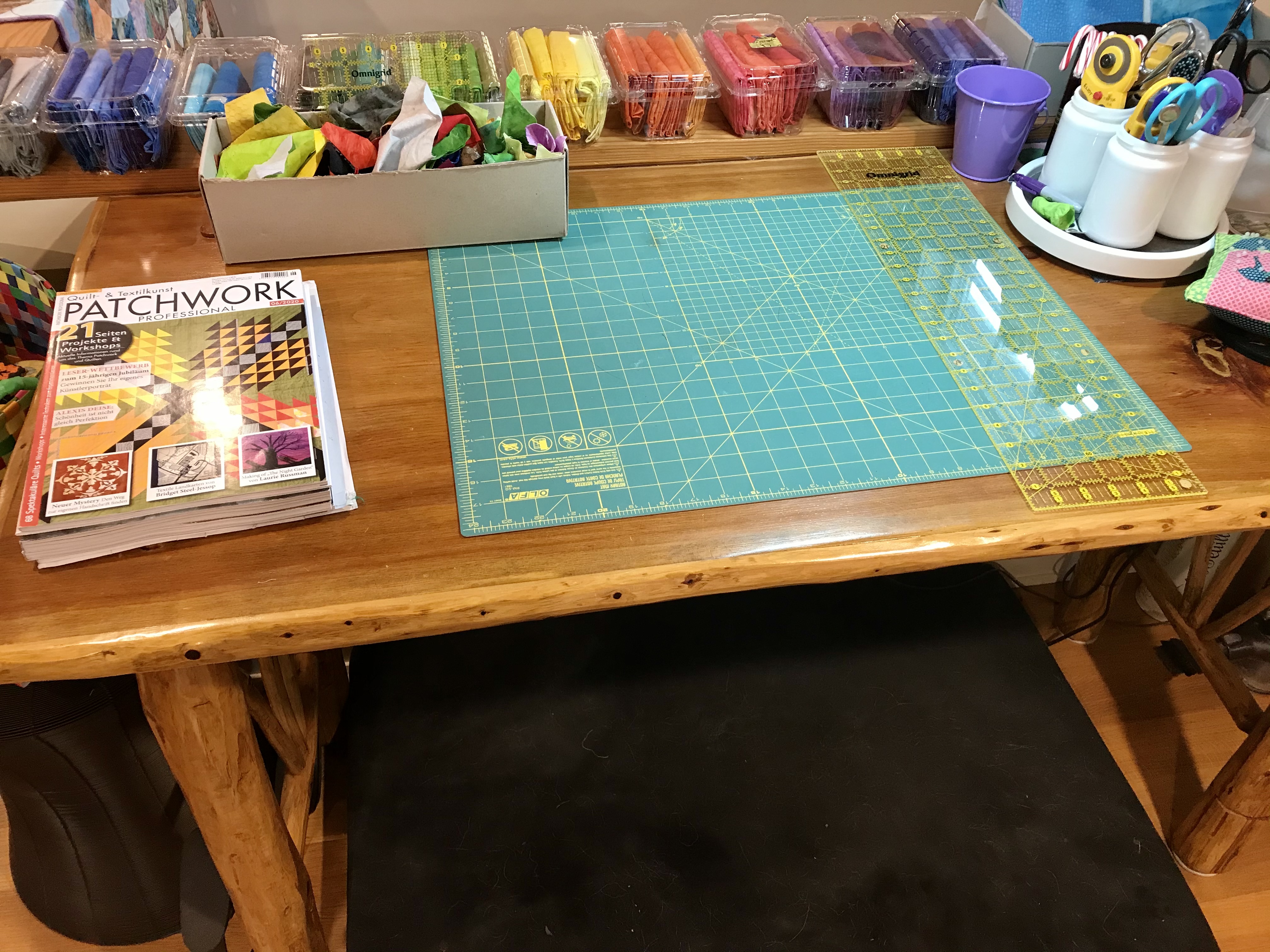 Welcome to Day 2 of Cheryl’s blog challenge! Today the theme is one of my favorites – our studios 💜. Mine is located in the loft of our house – an incredibly cozy but slightly challenging footprint! Above you see the room as you enter…to your left, my rustic cutting table (created by a very gifted wood artist) sits, complete with dog bed tucked in underneath for my German Shepherd Kane 🐾. That rainbow of fabrics you see tucked into little berry containers are my favorite Lava Solids from Anthology Fabrics – I adore them! http://anthologyfabrics.com/lavafatq-1-rainbow/
