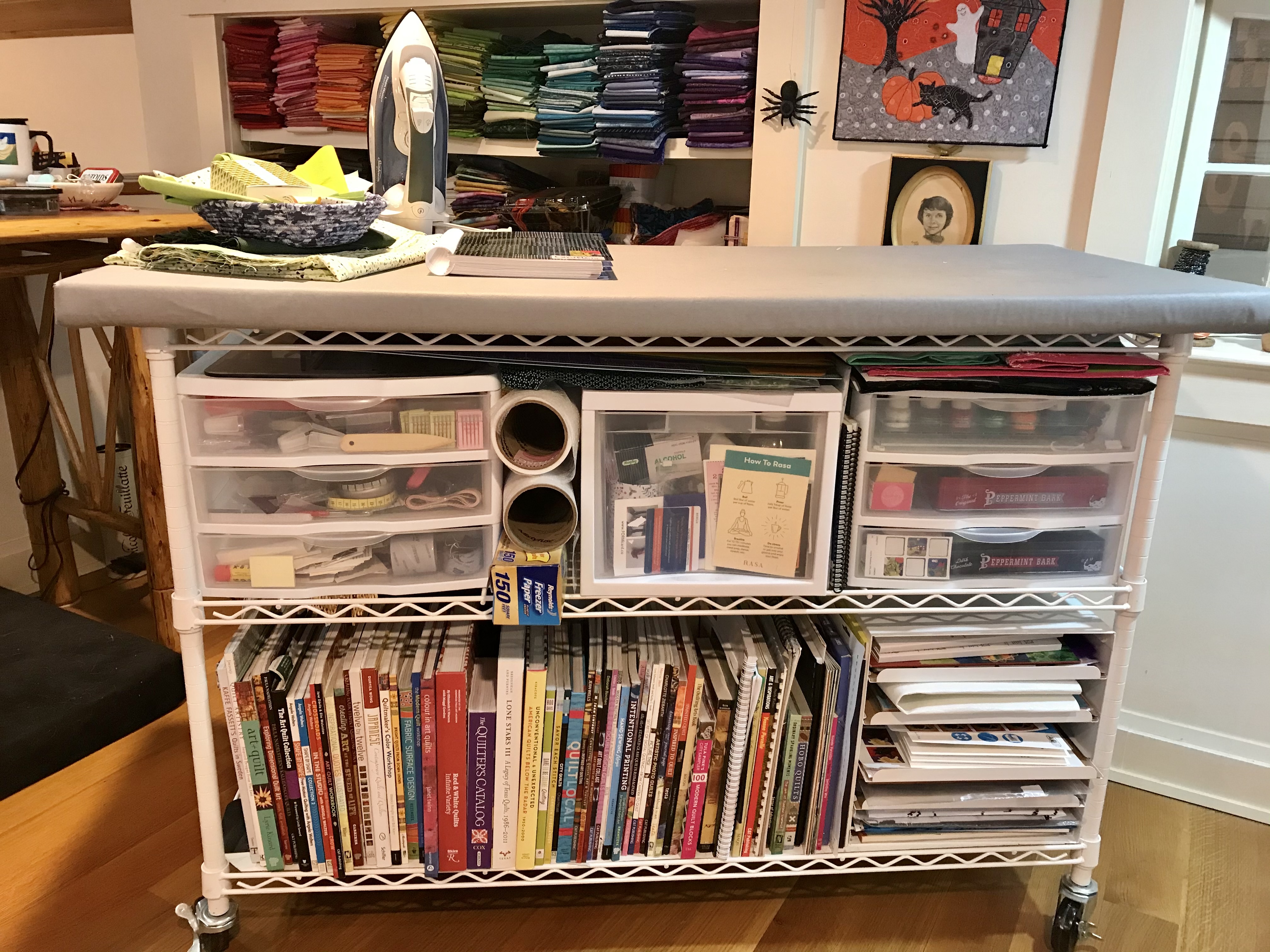 Sitting in the middle of the room, on wheels, is my rolling pressing station – my husband is a genius at designing these things! What an improvement from a rickety ironing board – this holds (some of) my quilting book collections and tons of small art supplies in small drawers. See those 2 rolls tucked in between the first and second plastic drawer sets? Rolls of my beloved Mistyfuse, the best ever fusible – more on that later this month! https://www.mistyfuse.com/