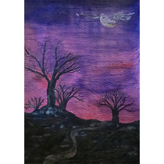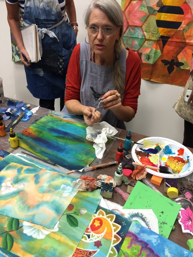 Today’s prompt is an easy one! I have taken classes from many gifted artists but my fave class was a full-day session in Houston with Judy Coates Perez (remember I mentioned her book yesterday?) ❤️ Her classes on techniques with acrylics on fabric are amazing – students come away with so many techniques to add to their toolkit. Here’s what my previously-white fabric squares looked like by the end of the day (surrounded by some from other students):