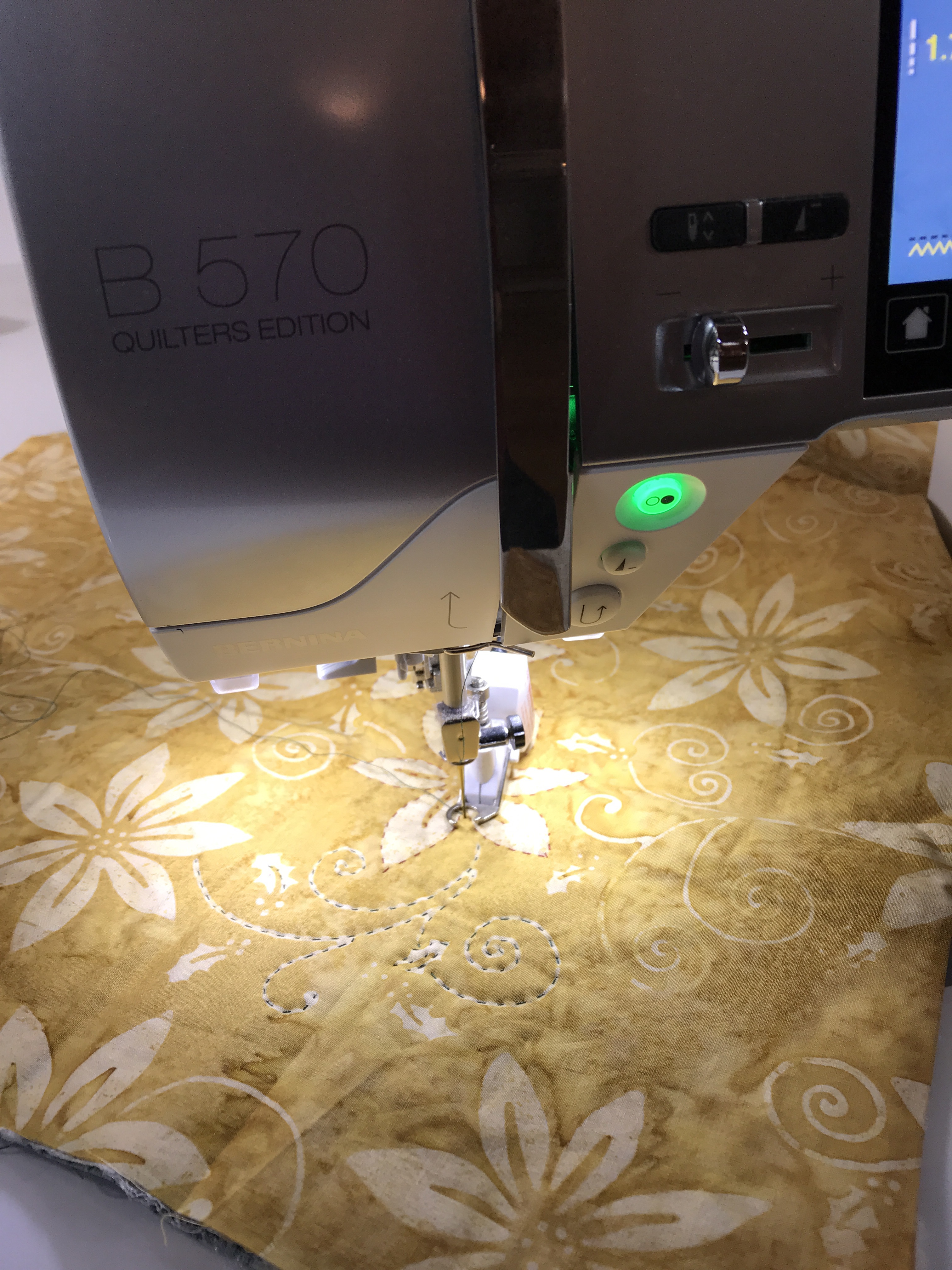 Mmmm. A little Modern Quilt Studio, a little Carol Eaton, and a batik I’ve had for years. I opted for the gold and green as the main fabrics…so, fused each to a piece of batting with MistyFuse and (after a very brief thought about hand-quilting), headed to my Bernina: