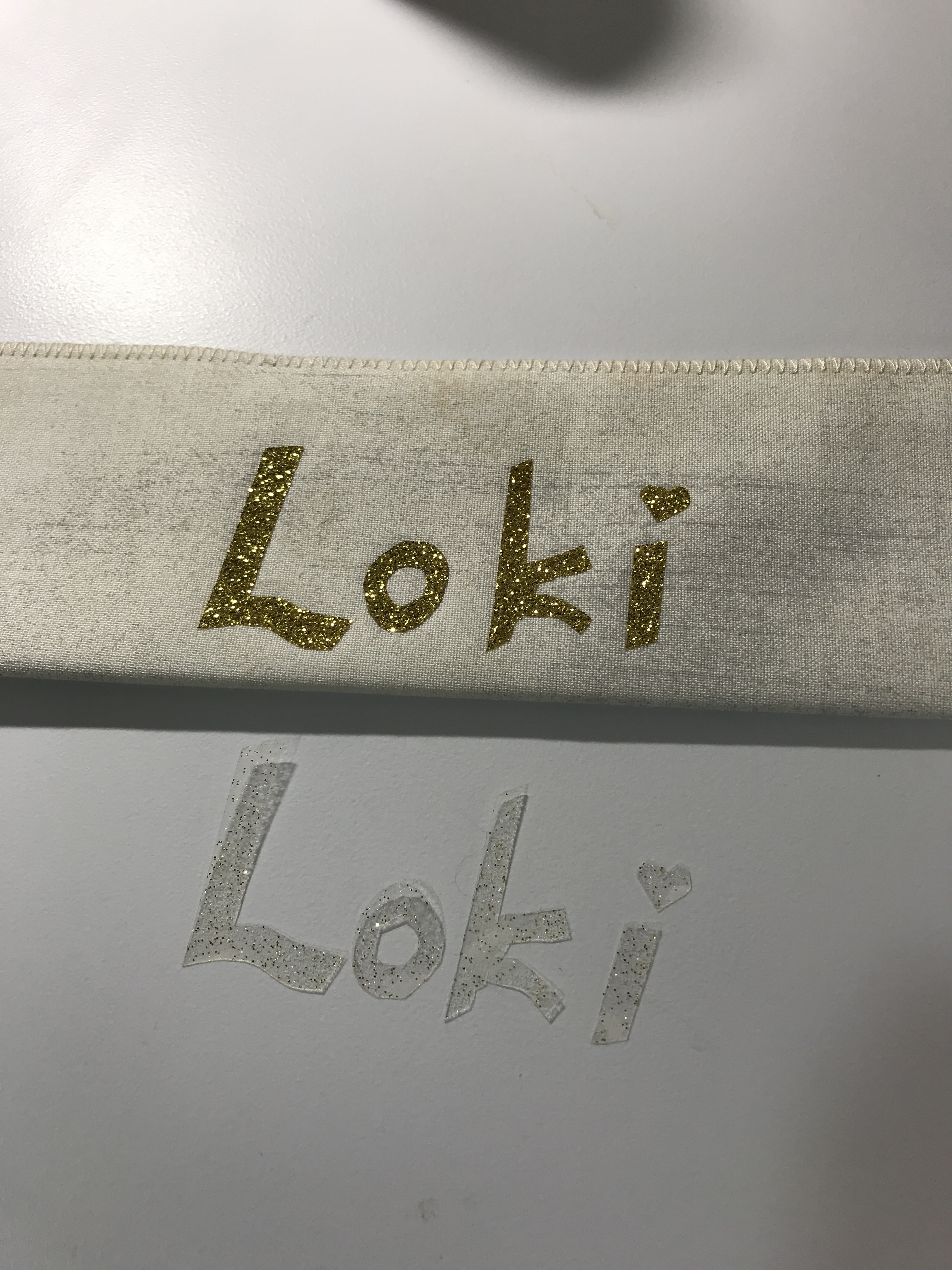 Then thought about how I wanted to do a top cuff. Opted for a cream colored Grunge…MistyFused some batting to give it heft, folded over and them got to work on adding Loki’s name.