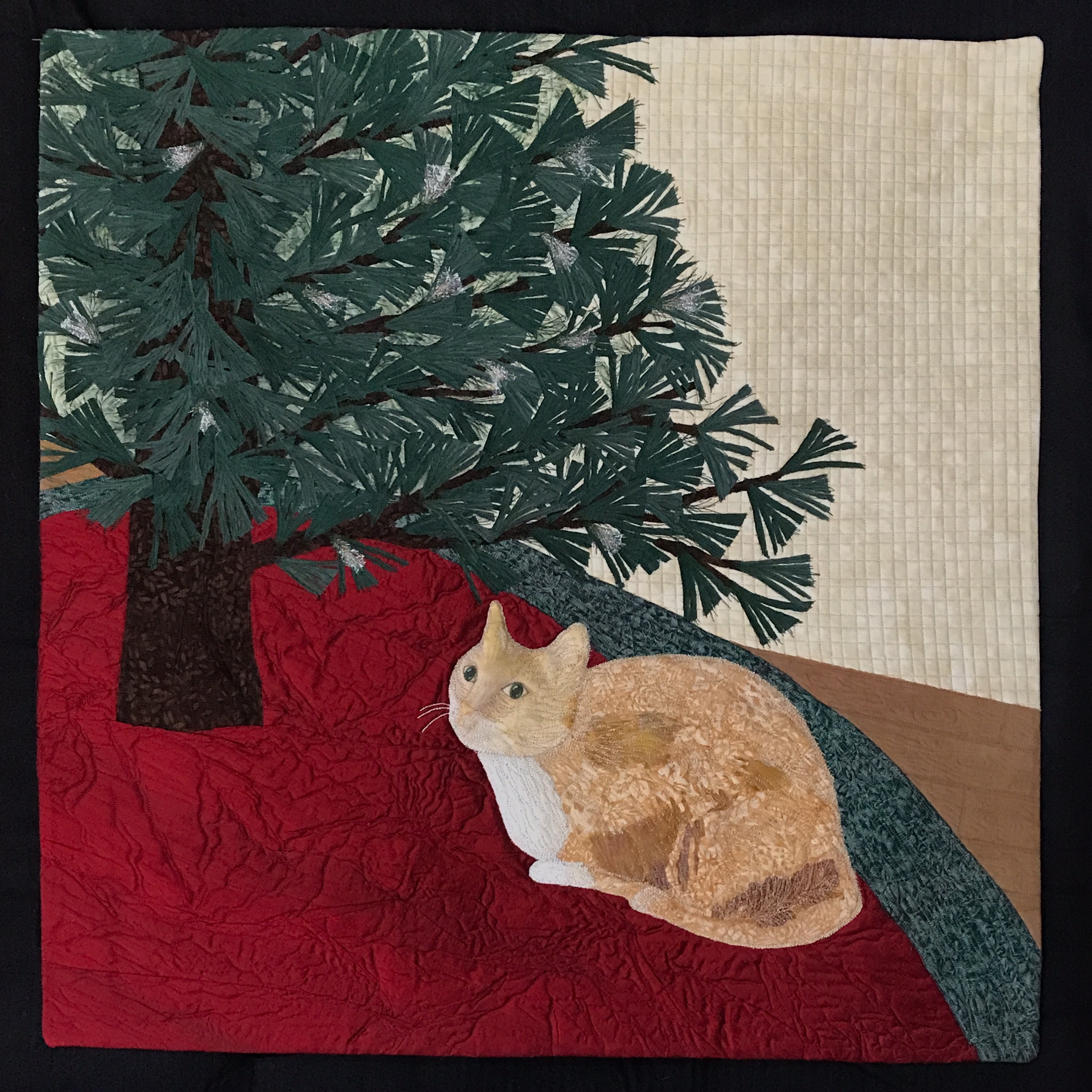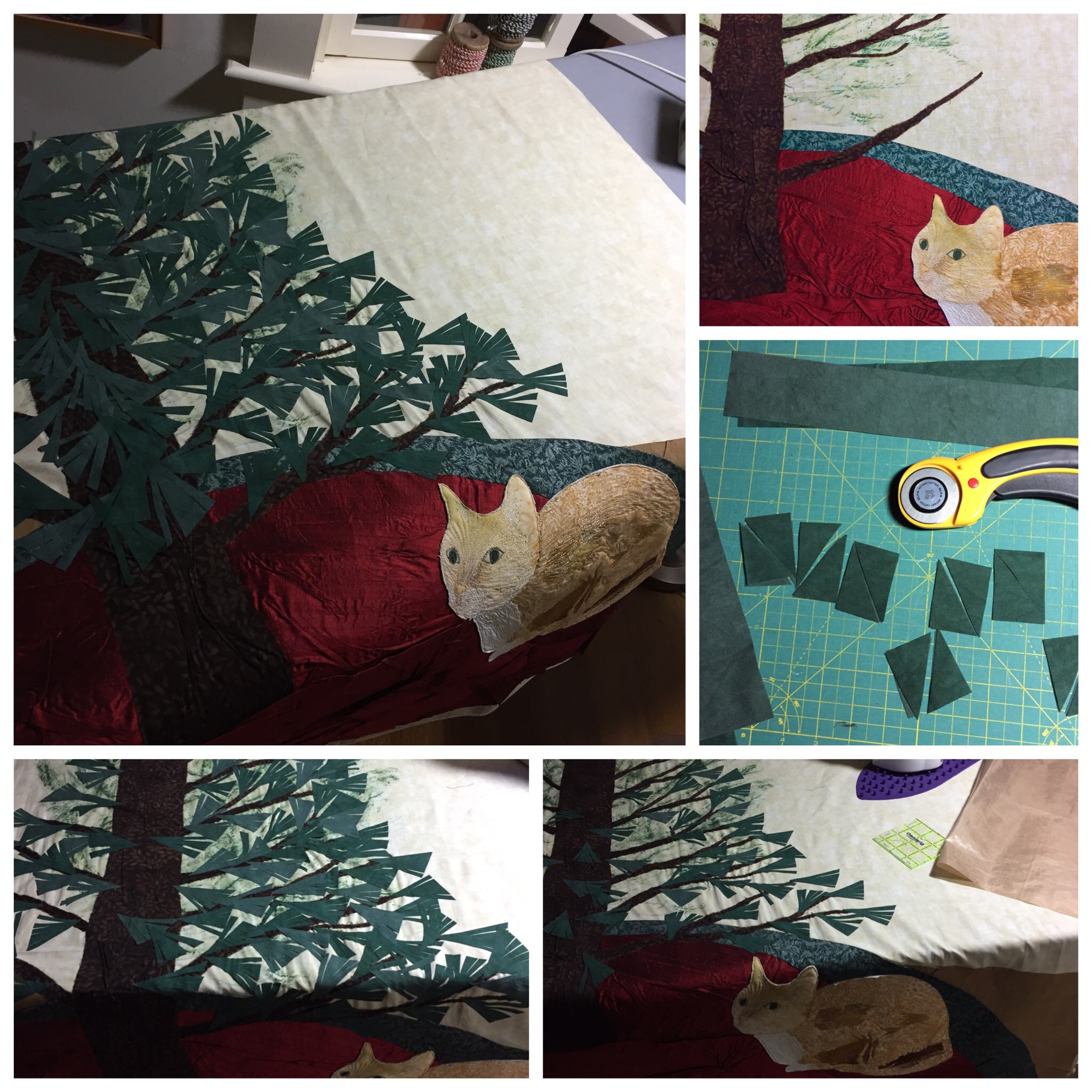 Next, ripped strips of fused brown batik were arranged (the trunk properly wrinkled) and fused. For the needles, I first thought it would be cool to do lots of rubbings with a dark green PaintStik, using a branch from the actual tree. It soon became clear that it would take an awful lot of paint and that I needed more texture to balance the dense tree skirt and cat, so the green Cherrywood it was: