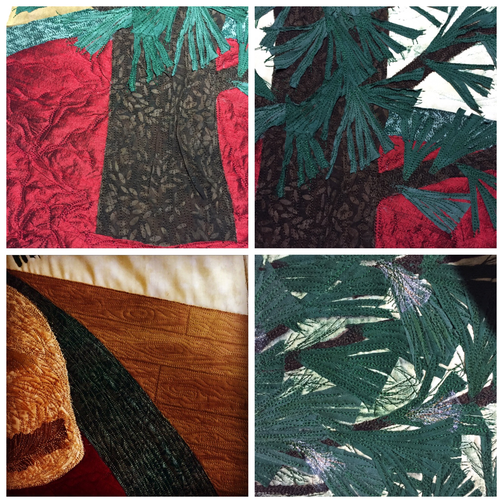 I used a number of fabric manipulation techniques here, none of which would be possible without the best fusible – Mistyfuse. https://www.mistyfuse.com/ With it, I was able to sculpt the “tree skirt,” create bark patterns on the “trunk,” fuse bits of delicate Angelina onto the “branches” to represent tree lights…as well as construct Jesse and the branches! So, do consider gifting your deserving self some Mistyfuse if you do not already have it in your studio. Read on to learn how this piece was created…