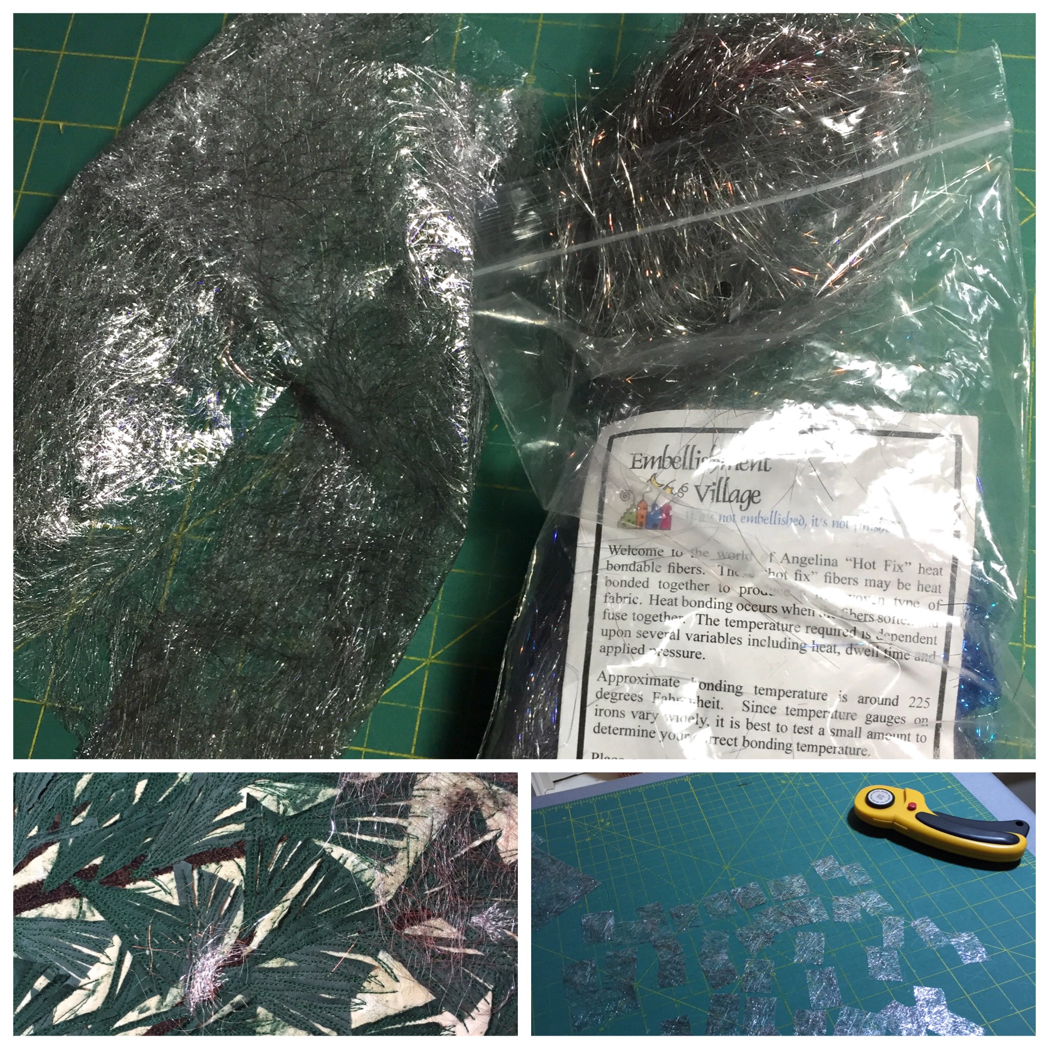The tree lights were a bit of a challenge…I tried simply stitching in some sparkly thread, but it was not nearly enough. Angelina to the rescue- I pressed a sheet of it, fused it, cut into small rectangles, and scrunched on top of each light location. If you’ve never tried Angelina, do…it is incredibly fun to use.