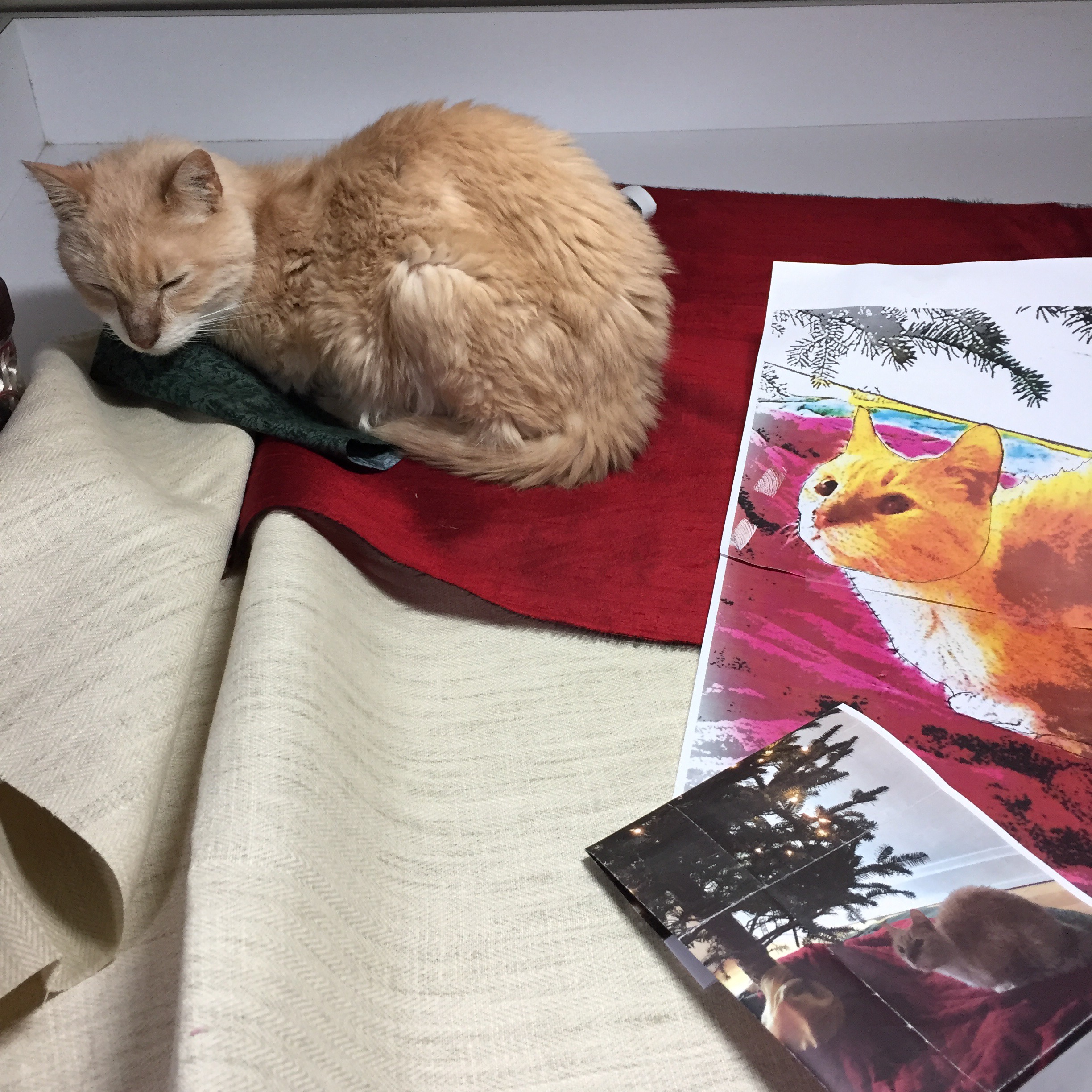 First step, run the photo through one of my apps to create an easier pattern. Then, to the stash! This is one of those very rare pieces for which I literally bought nothing 😇. I pulled a yard of dark red dupioni for the tree skirt…some dark brown batik for the tree trunk…2 shades of green Cherrywood for needles…a piece of beige linen for the wall (which sadly didn’t make the cut, was not really the right shade)…and, for Jesse, a mix of holiday-themed light gold batiks and Carol Eaton’s amazing snow-dyeds. As always, Jesse helped…