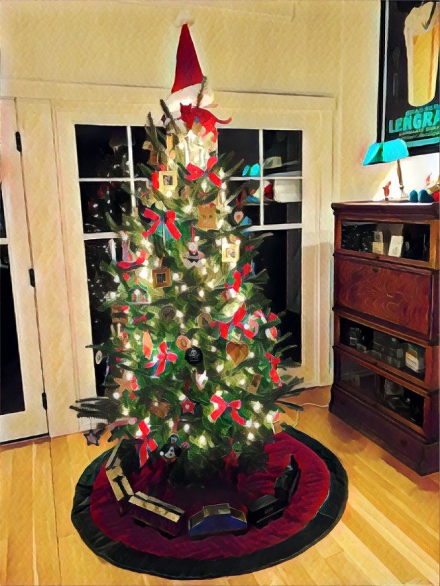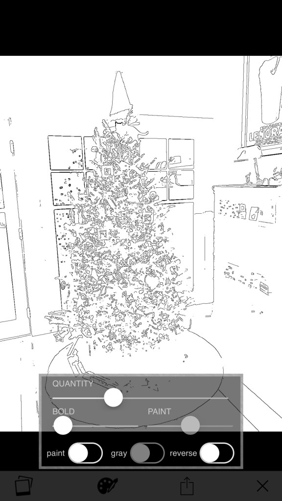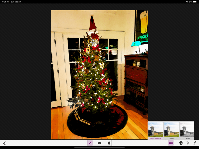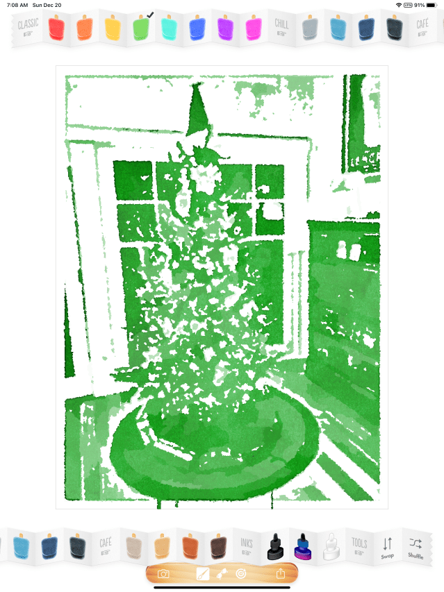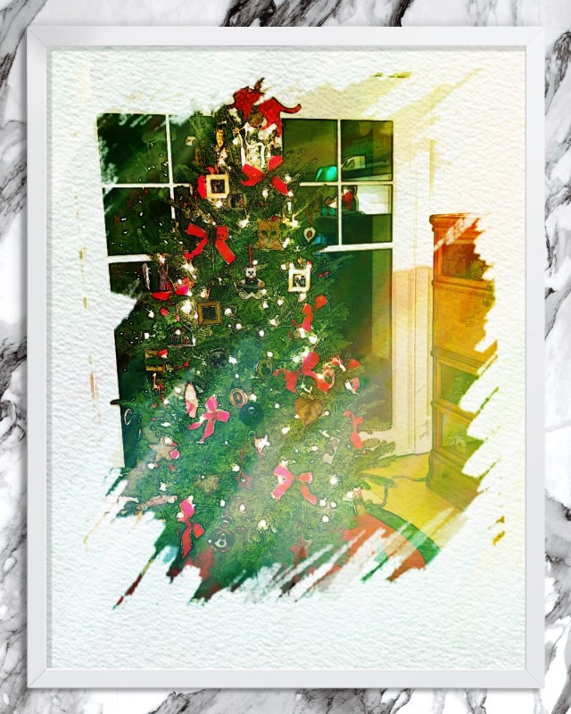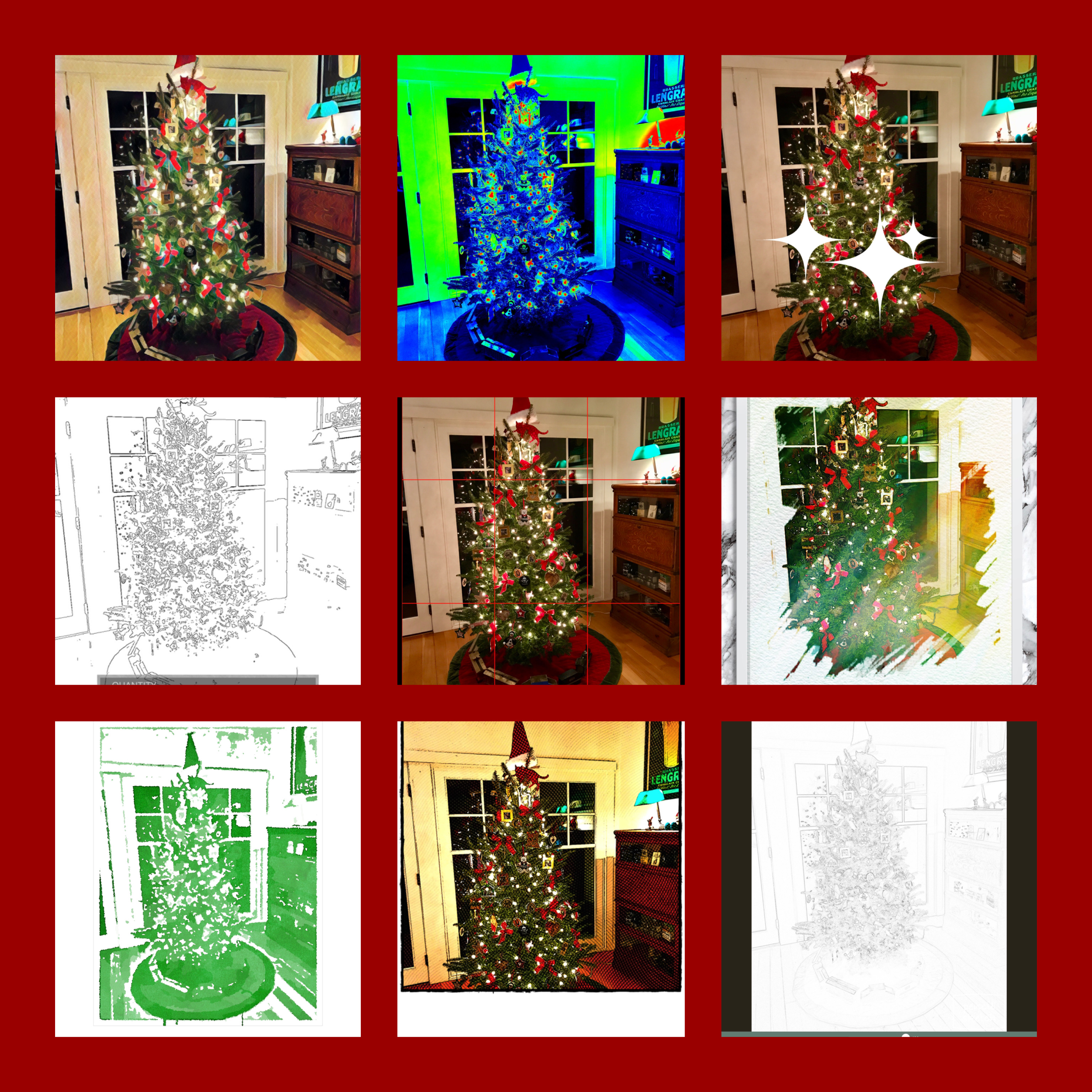 While the iPad app Procreate has become my go-to app for my art, there are dozens of fun, free (mostly) apps for your phone and tablet! Playing with these is a perfect way to pass a few moments (or a lot more) waiting in line for those errands. Here’s a quick survey of some of my faves, using a photo of my Christmas tree as the example: