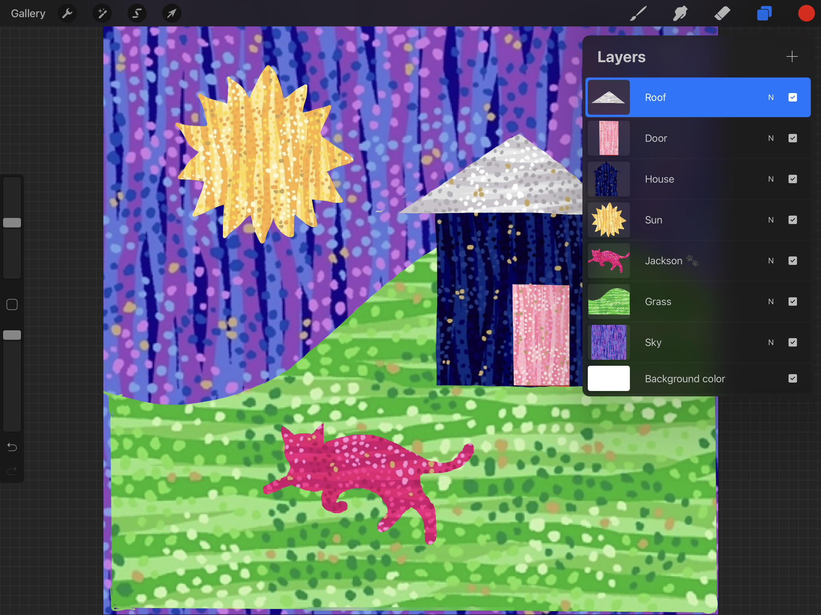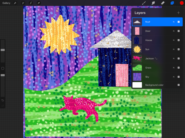 PS do you find that, as you build your scene, elements are disappearing behind one another? This is easy to fix…layers appear as they are stacked in that upper-right hand corner of your screen. Simply drag them up/down until, for instance, the house is in front of the grass. If you eyeball the list of layers, you’ll notice that they are ordered front to back.