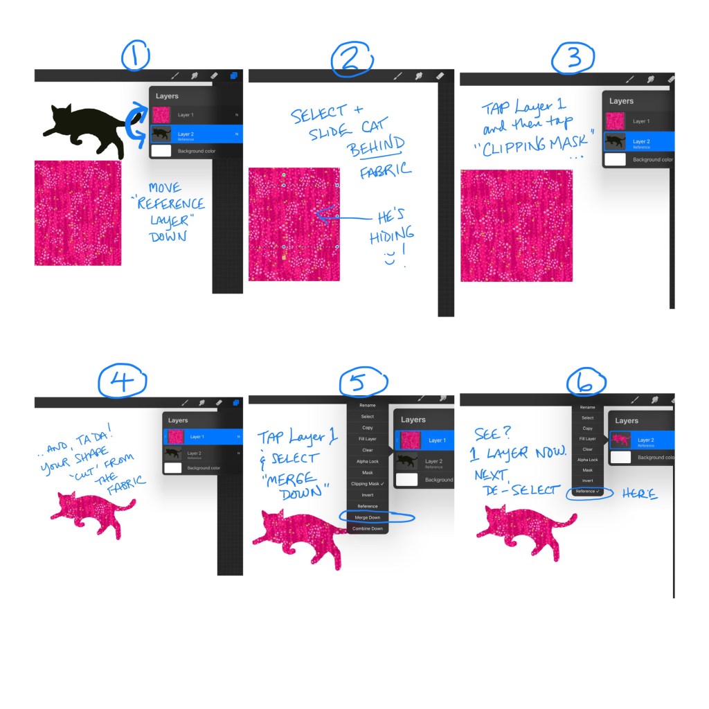 OK, now…we’ll assign “reference layer” to one layer, and “clipping mask” to the other – I find that the order is NOT intuitive so I keep a cheat sheet nearby at all times! REFERENCE LAYER = YOUR SHAPE…CLIPPING MASK = YOUR FABRIC SWATCH.