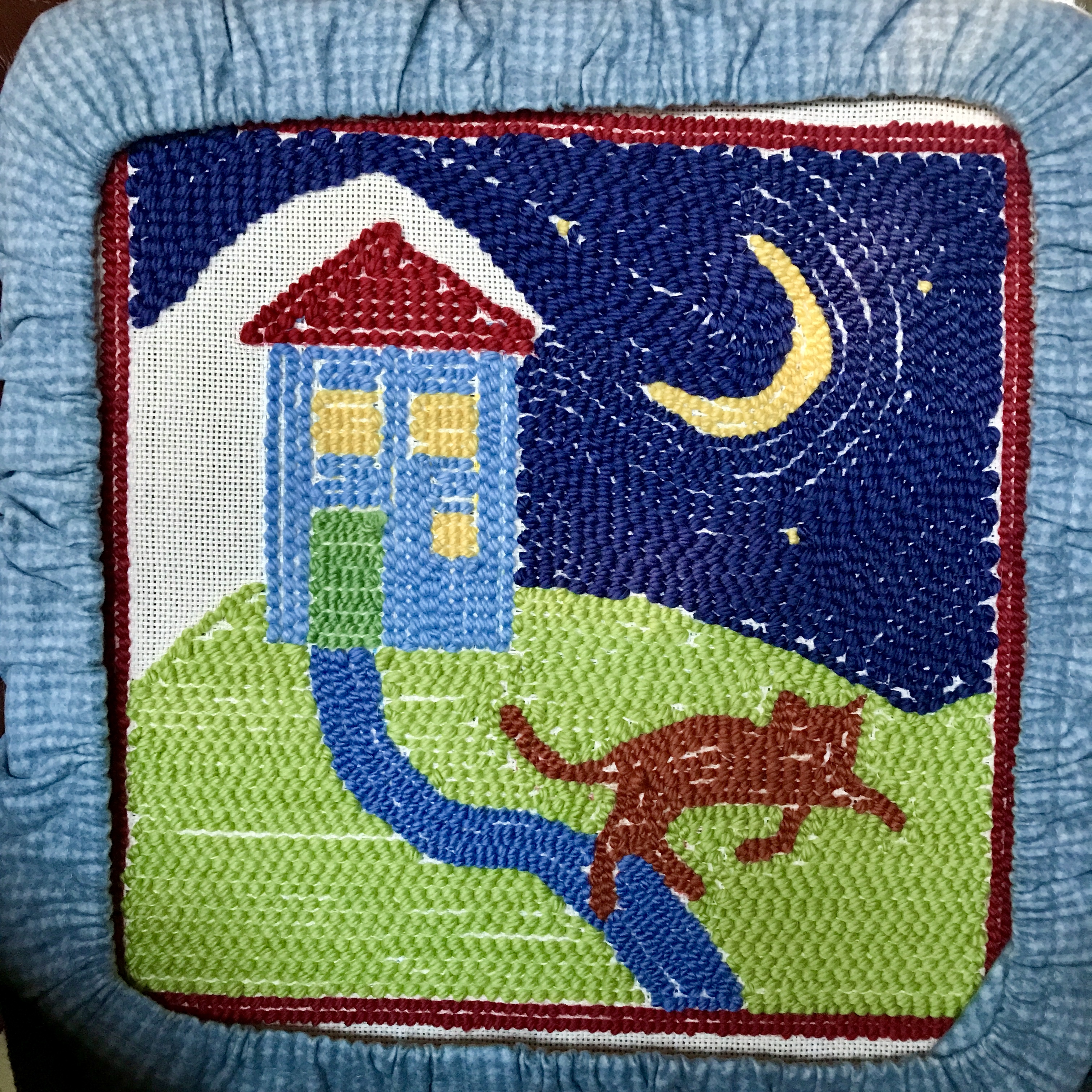 Another wonderful thing about needlepunching is how forgiving it is! The monk cloth is strong enough to withstand multiple rip-out/re-do rounds, as I did with Jackson (first a fat cat, now probably took skinny 😆) and the door (ripped out the medium blue, punched in a frame of dark blue then re-did the medium blue).