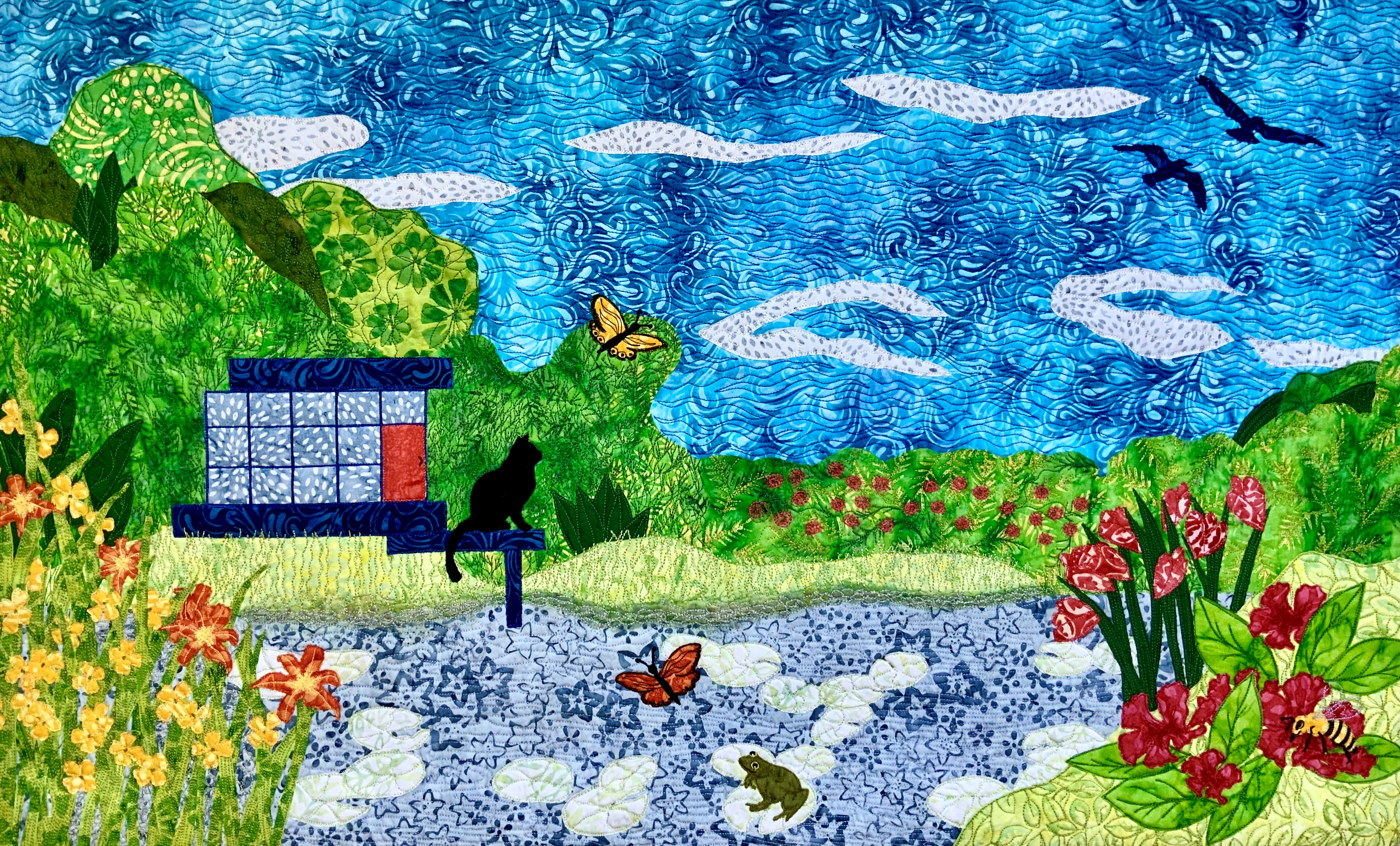 I created this summer landscape piece for a European quilt magazine from a photo I took a few years ago; the famous photographer Edward Steichen lived in a dramatic glass house at the water’s edge in my Connecticut hometown. An important part of my art practice is to take lots of photos- you never know which one could provide the spark for your favorite art quilt.