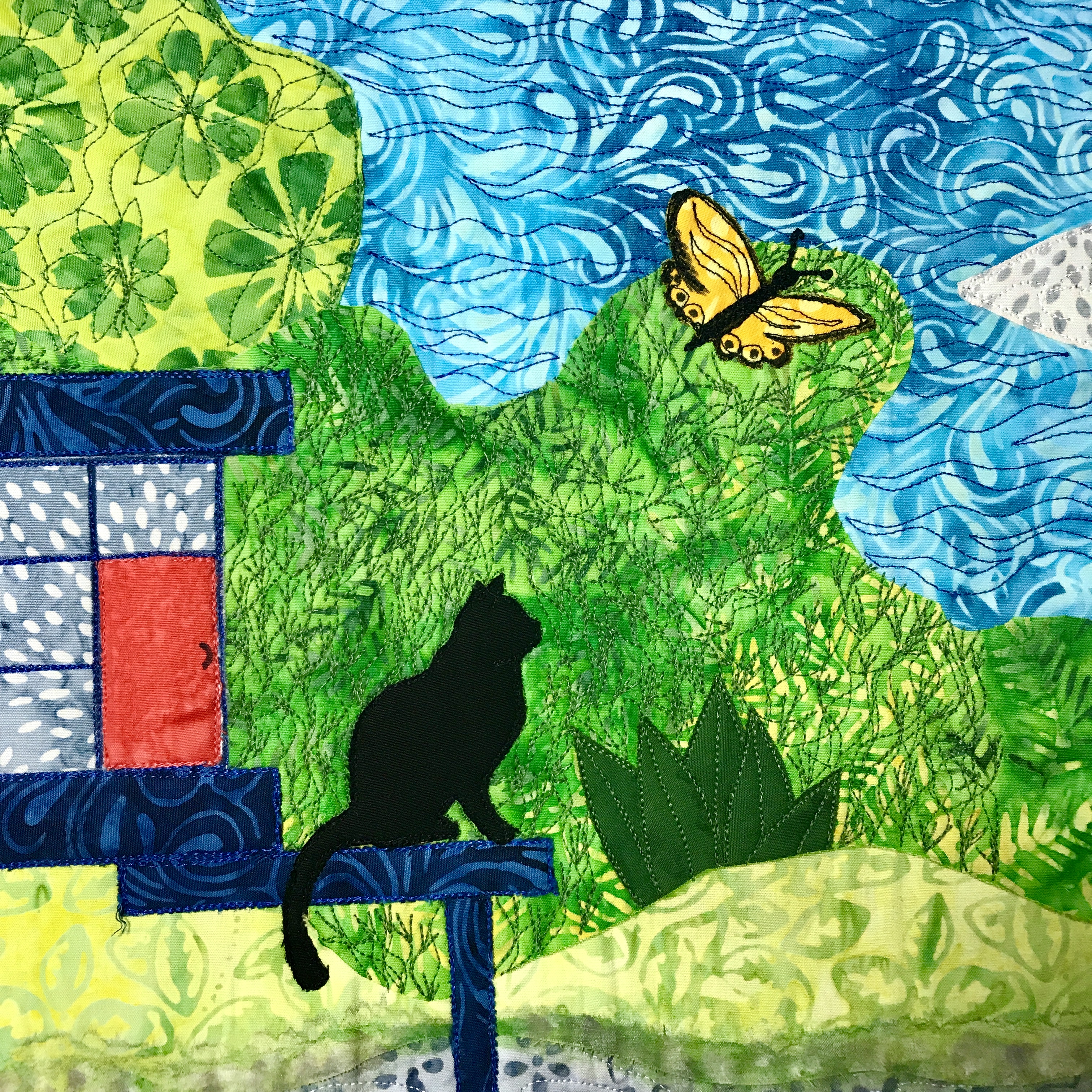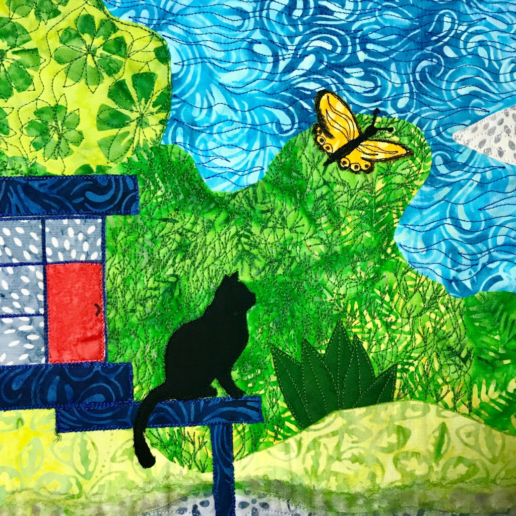 - Your quilt always tells you what it needs! The house deck looked empty so my cat Jackson moved in…then I realized he must be looking at a butterfly…and so it went for nearly 160,000 stitches!