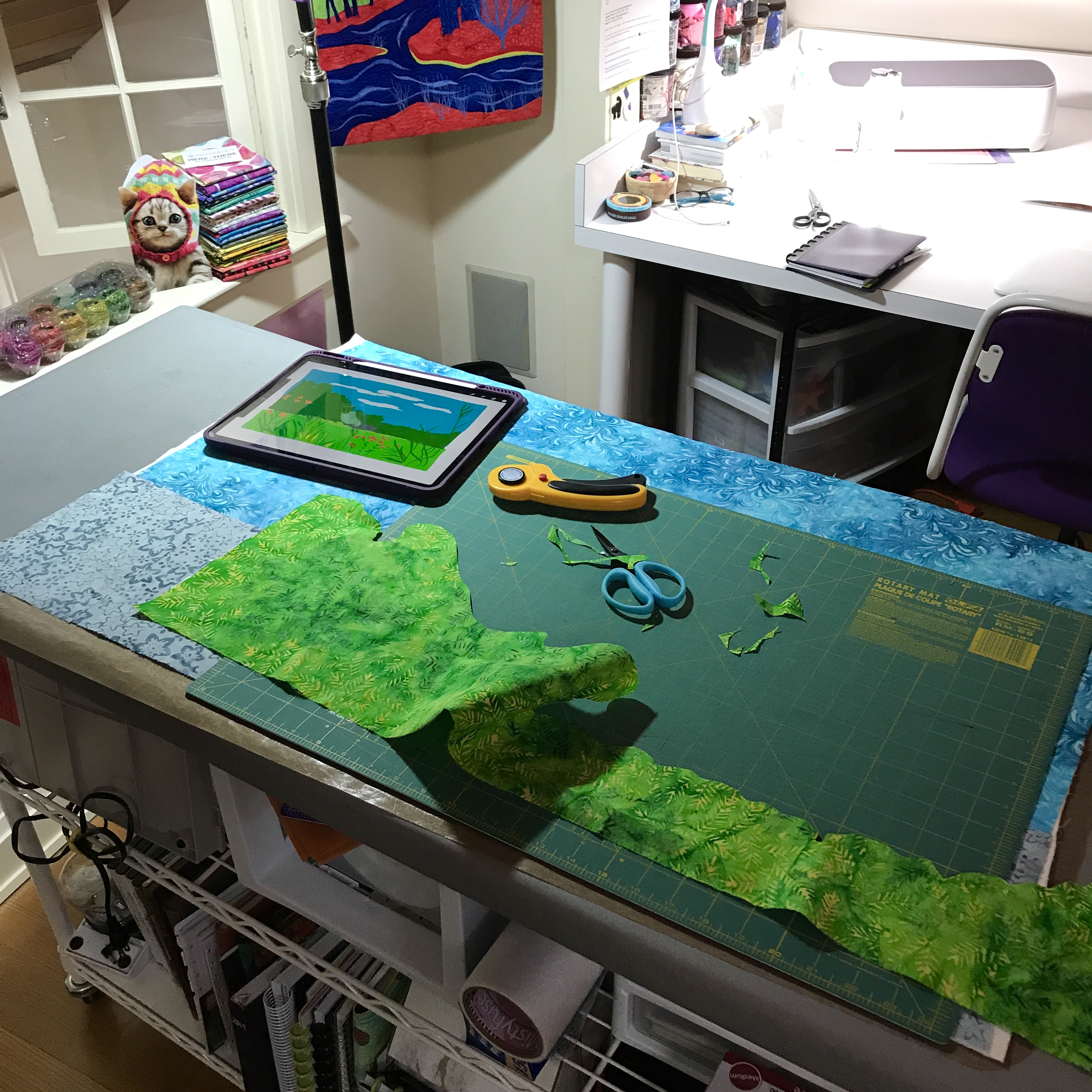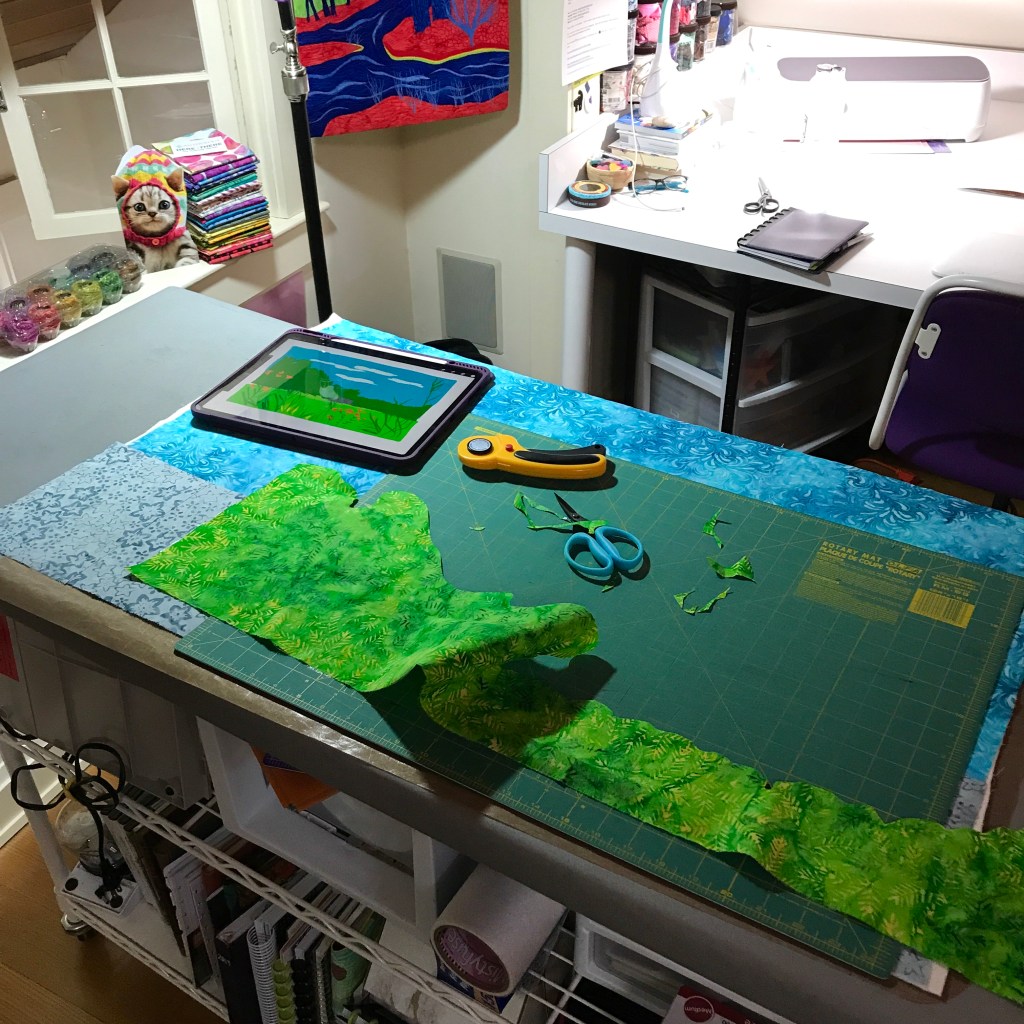 - Opening the Apple app for iPad, Procreate, I began to “rough out” the large background areas of the piece (sky, ground, pond, and so on) by free-cutting with my rotary cutter. Relax when you do this part – Nature does not always strive for perfect symmetry ;)!