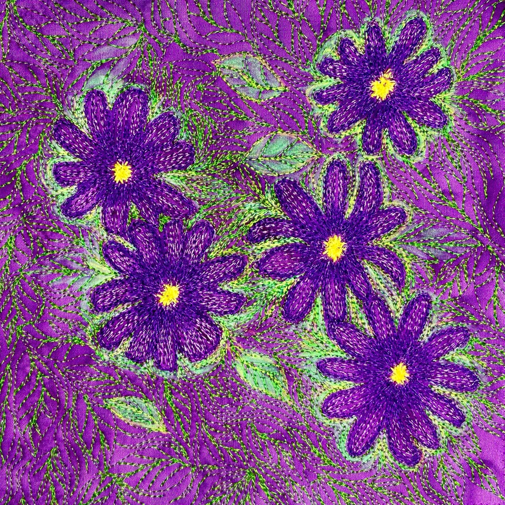 This square began with a few randomly-stitched yellow centers in 40wt, then petals stitched with 2 shades of purple through the needle…well, you can see why I put more than a million stitches on my machine each year 😉. I am now obsessed with thread as the star, and next up is a thread painting of an urban garden. Then maybe the next large piece…though I am now convinced that my pandemic project has become an ongoing irresistible way to play! 🪡