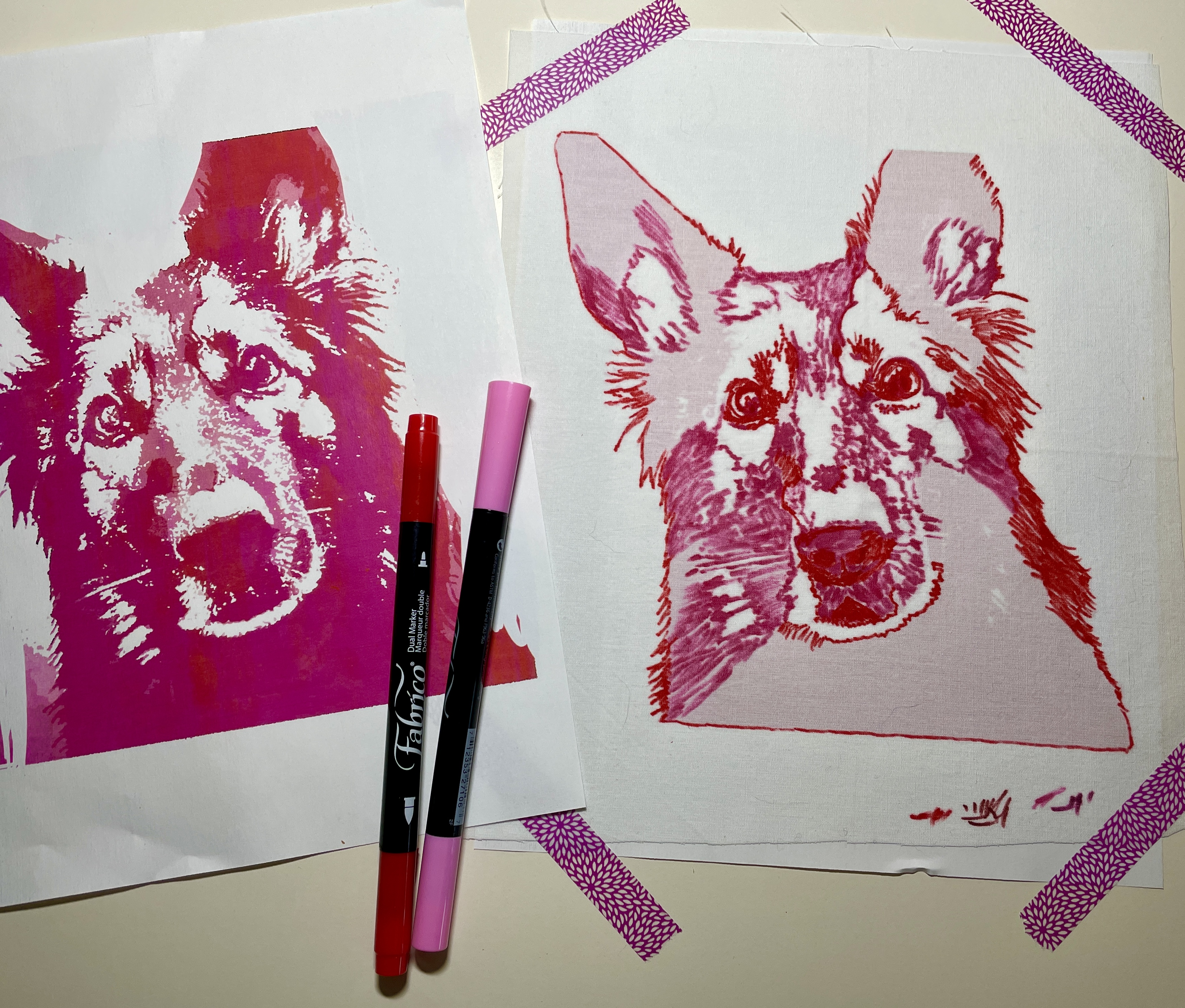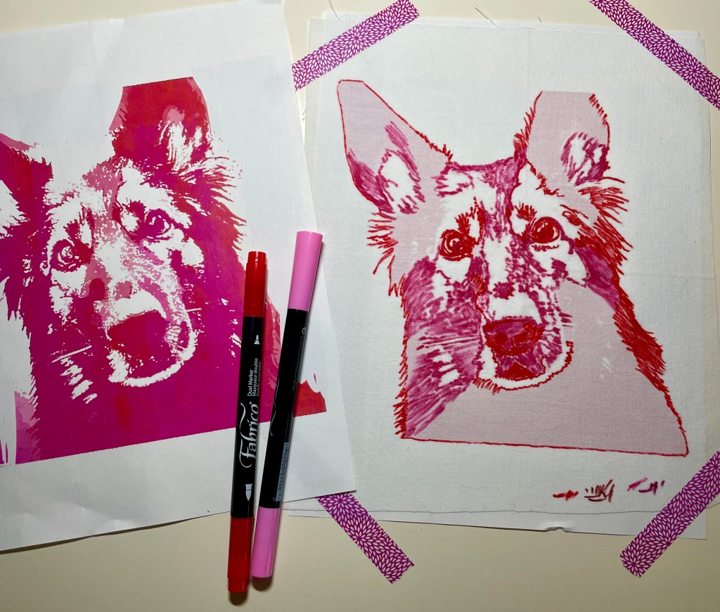 I printed this image (2 copies), then Mistyfused a square of white batik (important to use batik for this technique – higher thread count, less bleeding of ink). To trace the image, you may need a lightbox…or, if you have a near-white counter surface as I do, you can tape the printed image and the fabric down so they won’t shift (thank goodness for washi tape). See why you want the second copy? It can be super useful for reference. Now apply ink in the same direction as the fur growth (the original photo can be helpful here as well).