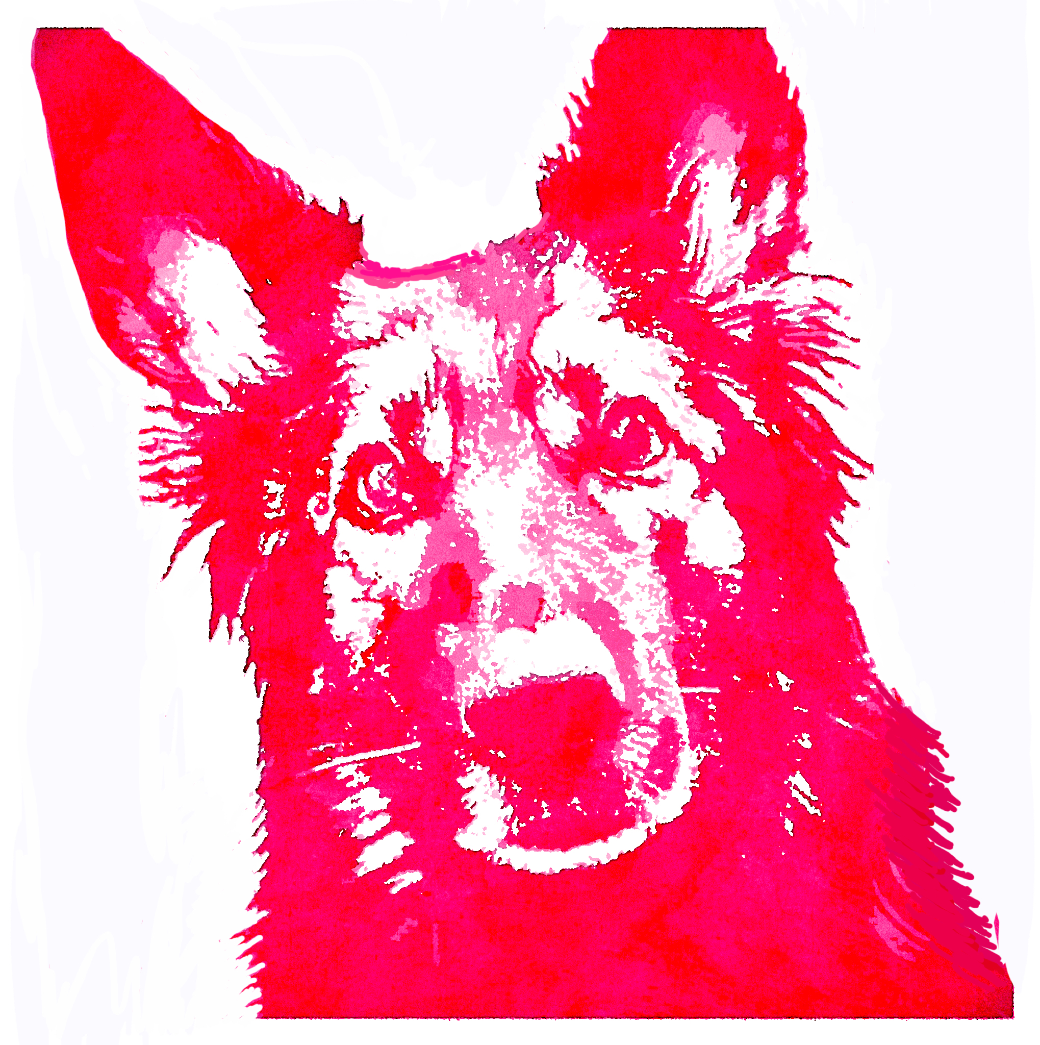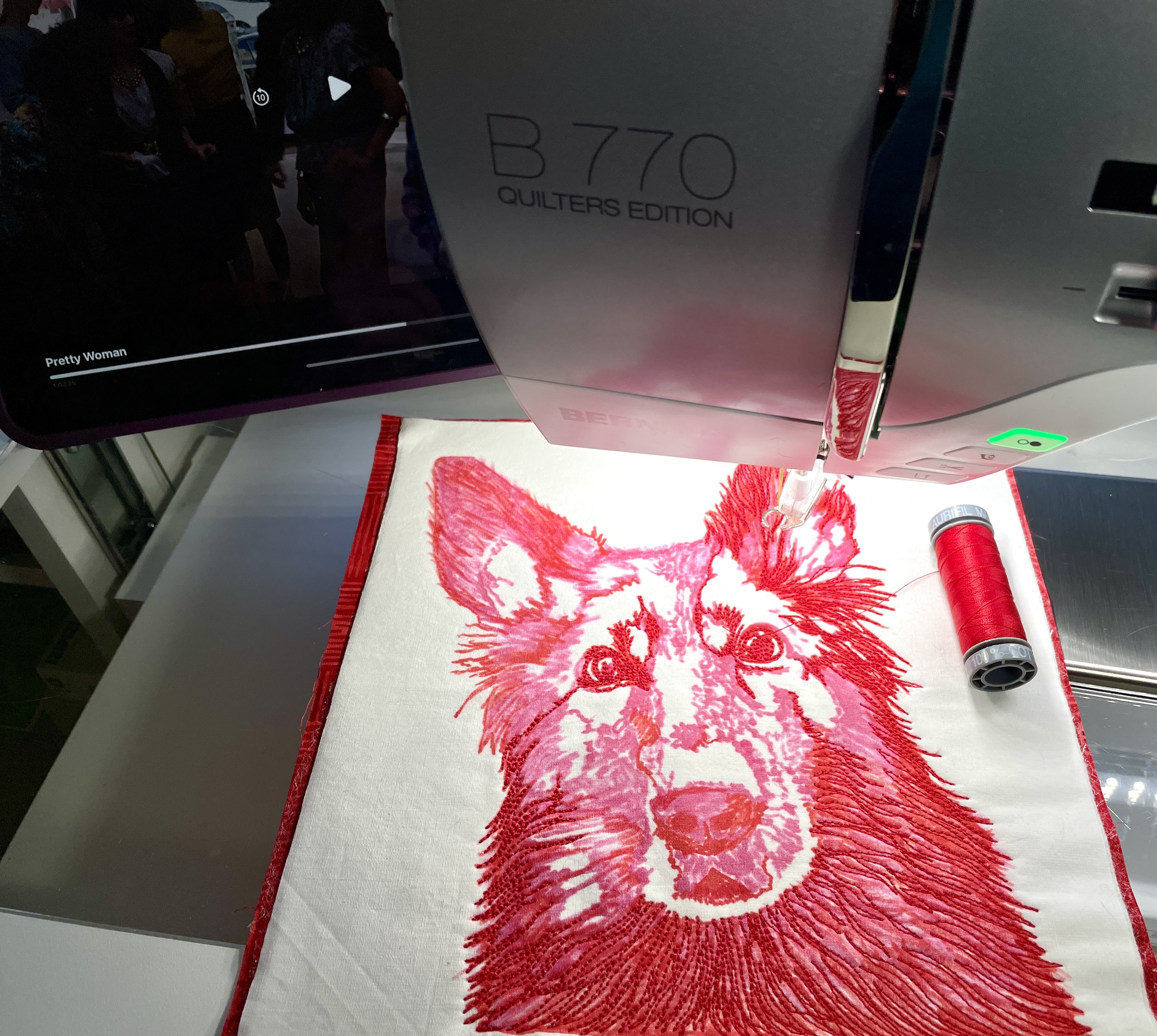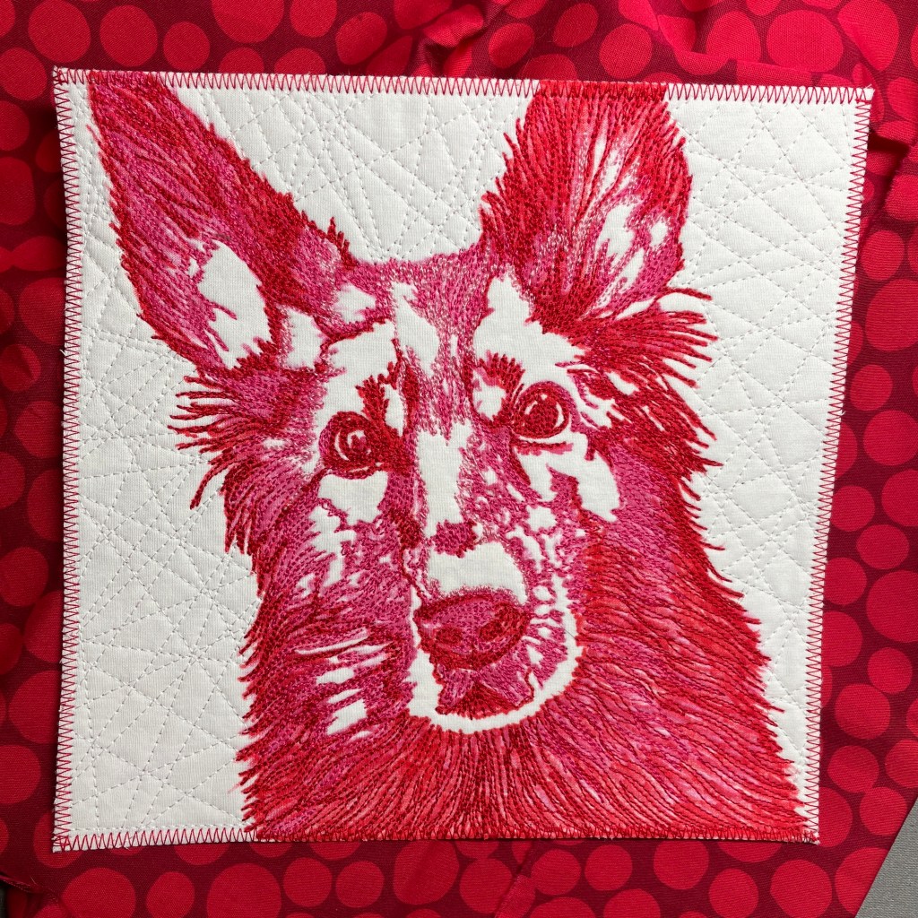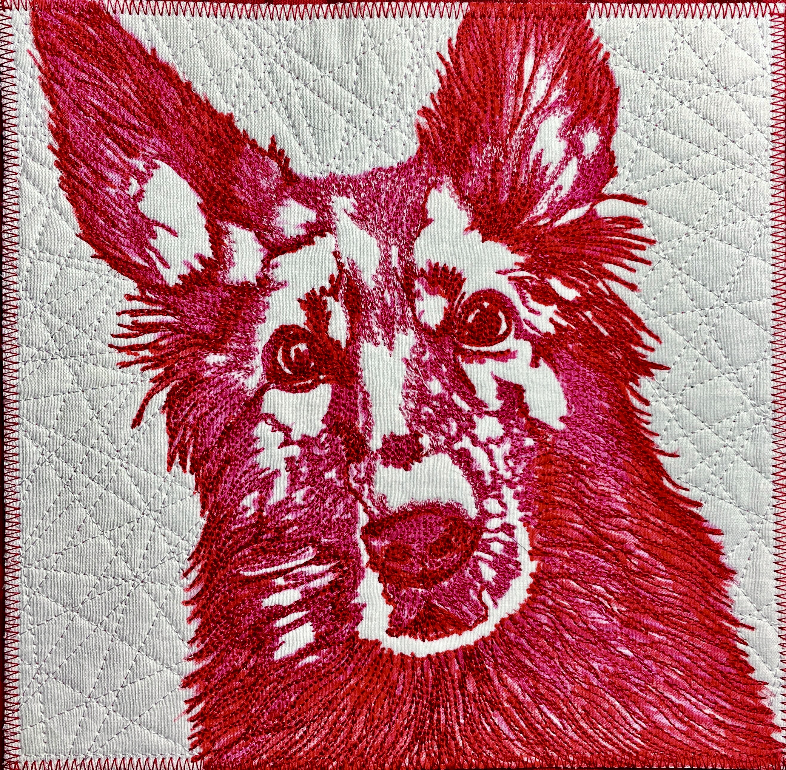 I worked with the red first, then the dark pink, then the light pink where there were highlighted areas. Once this stitching is done, quilt out the background with 50wt white Aurifil in a series of straight lines crossing each other…here I do raise the feed dogs and let my Bernina make sure the lines are straight, in contrast with my subject’s flowing fur ;).