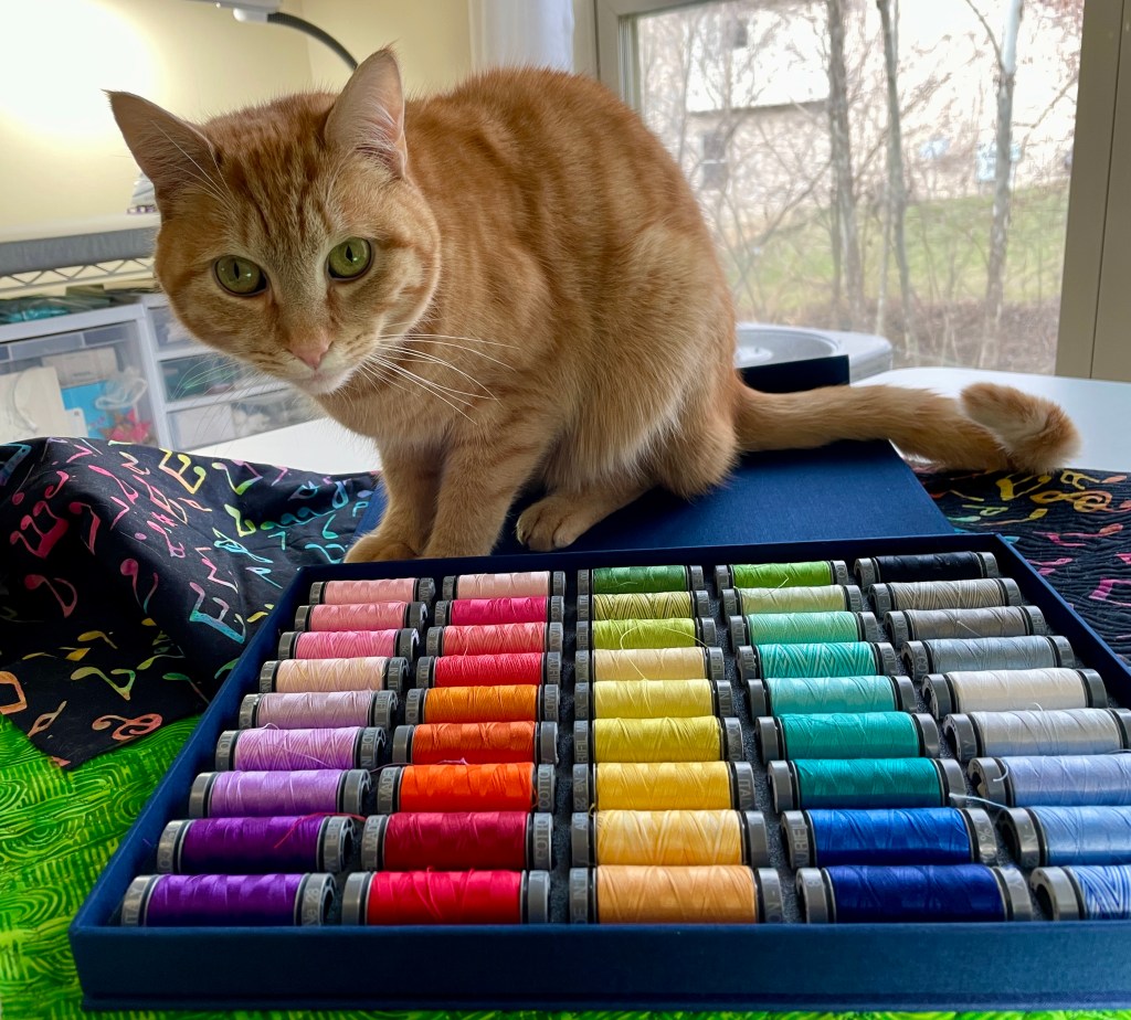 Awww. I played with color filters and thought about my usual raw-edged fused applique, but her amazing fur coat was going to make that a bit of a challenge and time was short. Solution: my ink-and-thread technique which I developed for Quilting Arts TV a few years ago, using my beloved Tsukineko inks and Aurifil 50wt thread. I decided to go with my new obsession, Aurifil 28 wt…you all really need this large selection—-